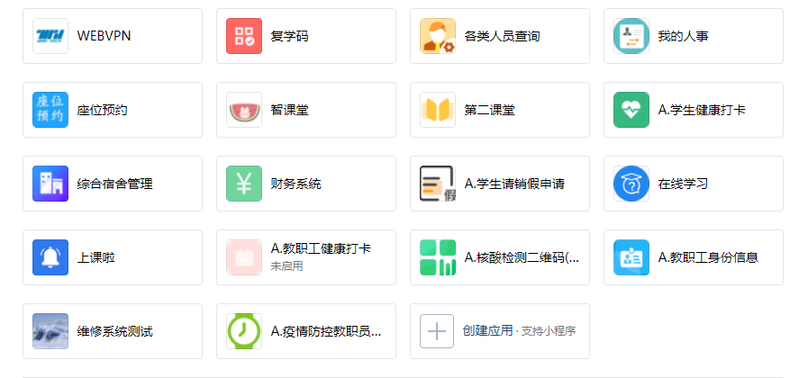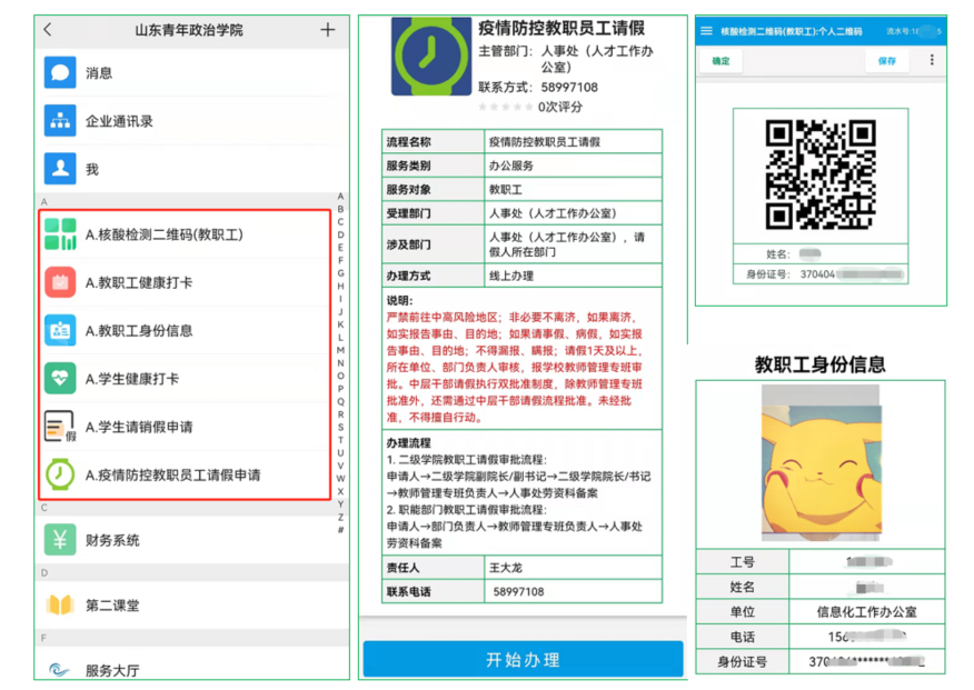 为保障疫情防控期间广大师生有关业务的正常办理,最大限度减少人员流动和接触,在前期“数据多跑路,师生少跑腿”“做有温度的信息化”的建设理念基础上,针对疫情防控的要求,提出了“扎根现有,突出优势”让用户“只问一次事,只跑一次腿,只进一扇门,只找一个人”的“四个一”服务理念,积极推进智慧校园“一站式服务大厅”应用深度和广度,快速新增“核酸检测二维码(教职工)”“教职工身份信息”“每日健康打卡”“疫情防控教职员工请假申请”“外来人员入校申请”等线上服务流程,助力学校高效快捷地开展防控排摸和动态管理工作。