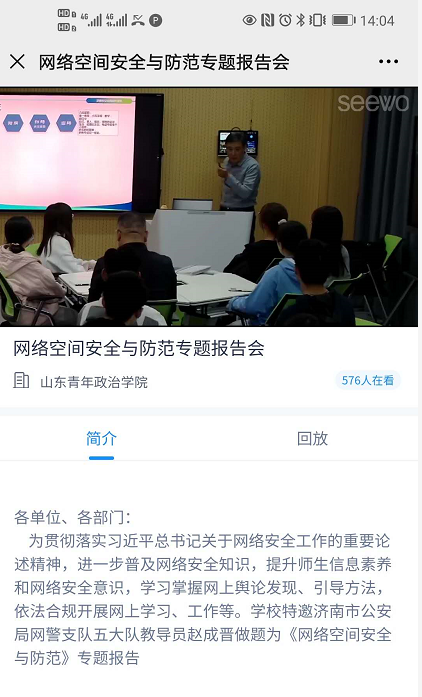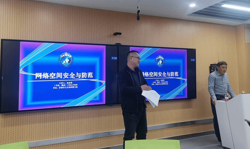 为贯彻落实习近平总书记关于网络安全工作的重要指示精神,进一步普及网络安全知识,提升师生信息素养和网络安全意识,学习掌握网上舆论发现、引导方法,依法合规开展网上学习和工作。11月5日下午我校特邀济南市公安局网警支队五大队教导员赵成晋做“网络空间安全与防范”专题报告,报告会由信息化工作办公室主任王智勇主持,宣传部、学生工作部、教务处、信息化工作办公室、团委、各二级学院站群管理员、业务系统管理员及部分学生参加本次活动。为防范疫情,本次报告会在知行楼智慧教室举行,通过智慧教学平台向全校教职工和学生进行了同步直播。
