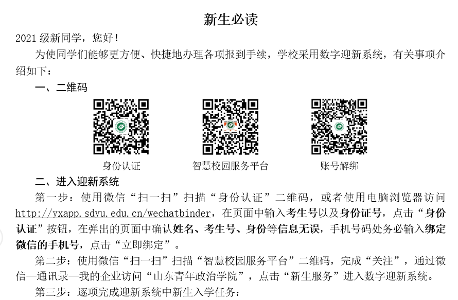 在报到前,随着录取通知书一块发出的,还有一封新生必读,详细的介绍了智慧校园和智慧迎新的使用。新生通过个人微信,关注学校企业微信,就能完成一系列的入学任务、调查问卷,了解学校相关情况,在入学前对学校和大学生活有了充分的了解。