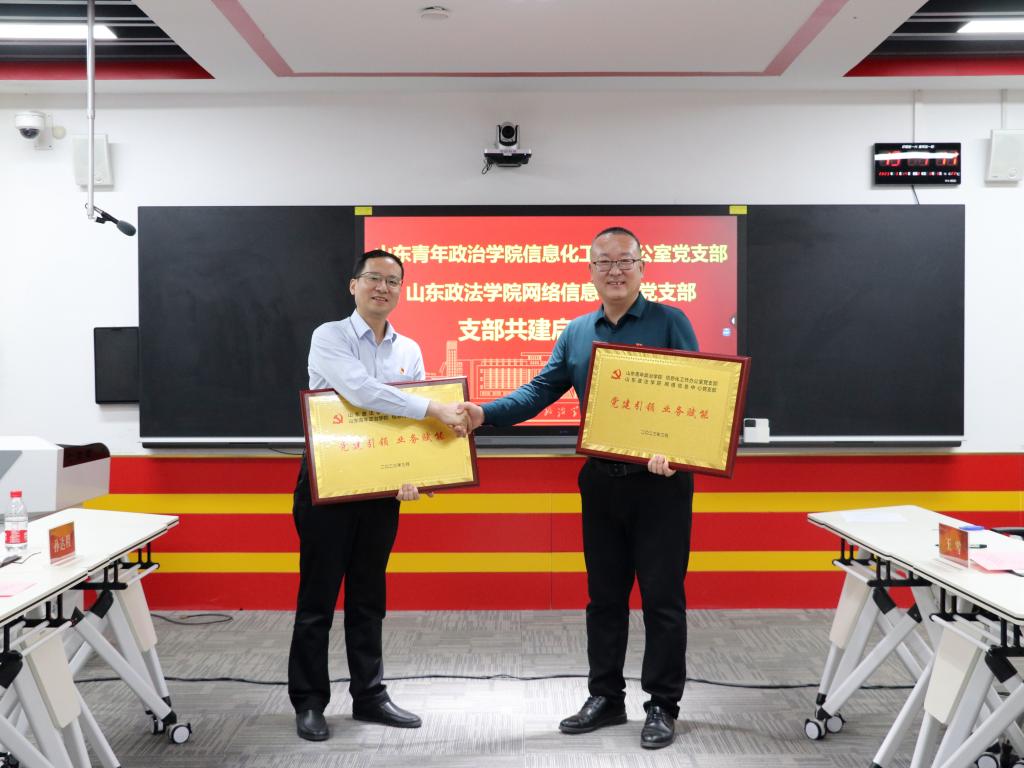 随后,学校信息化工作办公室党支部书记王智勇和山东政法学院网络中心党支部书记张胜春分别介绍了各自支部基本情况,并举行了双方交换党支部共建名牌仪式。