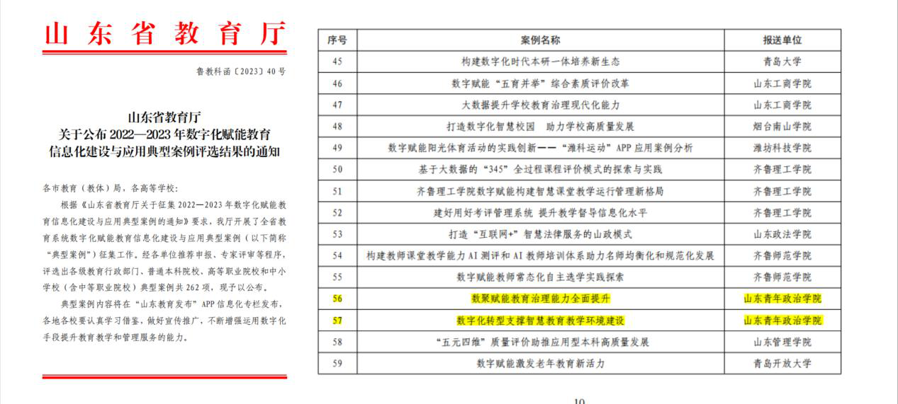 近日,山东省教育厅公布了2022—2023年数字化赋能教育信息化建设与应用典型案例评选结果,我校报送的2项案例《数聚赋能教育治理能力全面提升》《数字化转型支撑智慧教育教学环境建设》全部入选。