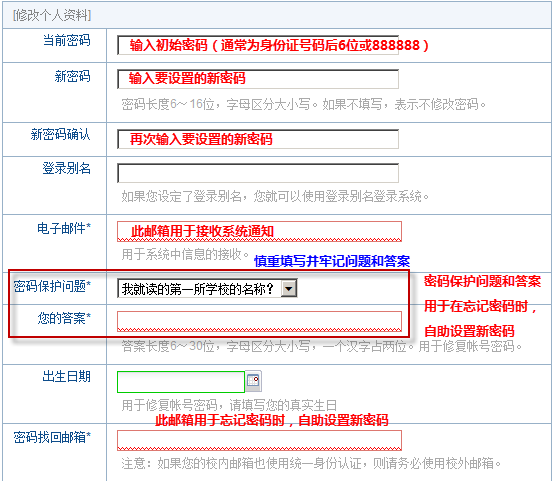 第一次登陆信息门户时,为了保证使用安全,系统首先弹出“个人资料修改”页面,用户需要重新设置密码,填写各项带“*”的选项,保存后才能正常进入。以后登陆信息门户,系统不会再自动弹出“个人资料修改”页面。
